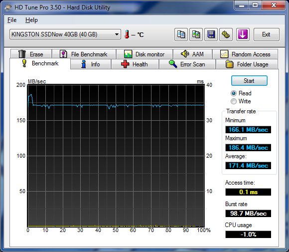 Voilà pour la description physique de ce Kingston V 40 Go, que peut-on tirer de HDTune et CrystalDiskmark? Le firmware utilisé était le dernier disponible lors du test de ce SSD. Pour ce qui est des débits, on atteint légèrement plus que les spécifications annoncées, pas de quoi pavoiser pour autant particulièrement en écriture séquentielle. Ce point n'est toutefois pas des plus problématiques sur un SSD de cette taille. Voyons donc le détail avec IOMeter.