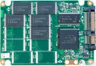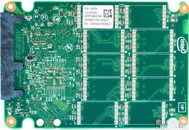 Côté PCB, le contôleur Intel intégré annonce tout de suite la provenance, accompagné d'une puce Micron de 32 Mo pour le cache et de 5 puces MLC 34nm du tandem Micron/Intel de 8 Go réparties sur une seule face afin d'atteindre les 40 Go annoncés. La face inférieure du PCB est vierge de tout composant, ce design permet d'alléger les coûts, point très important dans l'entrée de gamme.