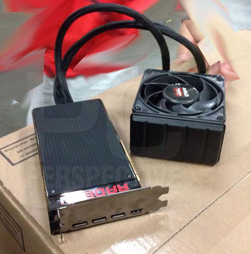 Si c'est demain qu'on verra pour la première fois en live la Fury, et qu'il sera porté à notre connaissance la nouvelle gamme complète après des semaines de spéculation, les fuites permettent déjà de voir la belle au repos. Mais PCPerspective est le premier à nous proposer des photos complètes de la carte reliée à son radiateur de watercooling, et pas par bribes, tantôt un nichon PCIe, tantôt une fesse le recto de la carte, etc. Quand vous aurez vu les clichés sur le lien situé sous l'image, vous remarquerez peut-être deux trucs paradoxaux : autant le PCB est court du fait du package GPU+HBM, autant le lot radiateur+moulin est super épais, limite on pourrait croire à un ventilateur de 30 ou 38mm ! C'est donc à peu près tout, c'est bien par l'arrière que se fera la sortie des tuyaux d'arrosage.