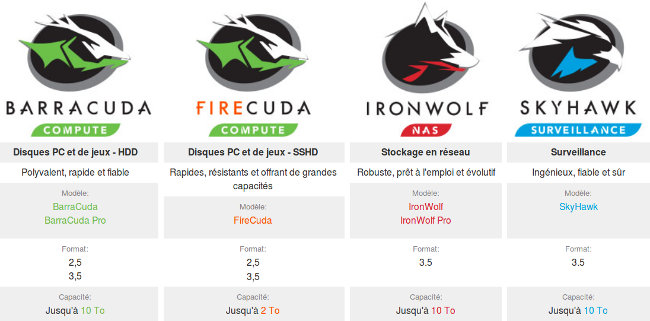 Leur gamme grand public se segmente en quatre dénominations. Les BarraCuda (comme le poisson) et BarraCuda Pro (comme le poisson qui sait esquiver les filets) qui pourront grimper jusqu'à 10To et visent tout le monde, les FireCuda (comme le poisson grillé ?) qui sont des SSHD grimpant à 2To et offrant un peu plus de réactivité, les IronWolf (comme un loup en fer ?) qui colleront jusqu'à 10To dans un NAS et enfin les SkyHawk (parce que les faucons terrestres c'est nul) qui pousseront jusqu'à 10To et sont calibrés pour les besoins des machines qui enregistrent beaucoup, type surveillance vidéo.
