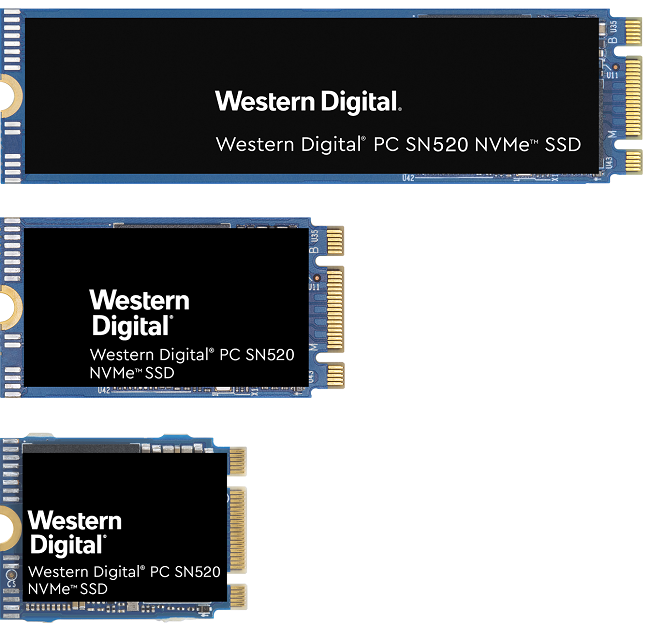 Les SN520 se distribuent en différentes versions, de 128 Go à 512 Go au format M2 (2280, 2242, 2230) pour une connexion en NVMe Gen3 X2, des performances entre 1 500 et 1 700 Mo/s en lecture séquentielle et 1 400 à 800 Mo en écriture. Pour les accès aléatoires, les performances dépendent une fois encore de la capacité, avec 95/90 KIOPS en lecture/écriture pour le plus gringalet, et 270/280 KIOPS pour le plus testicouillue.