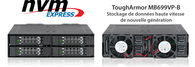 La grande passion d'ICY DOCK, c'est bien de caser des adaptateurs de partout, pour toutes les tailles (même si il paraît que cela ne compte pas) et pour tous les goûts. Dernièrement, c'était un boitier en 5,25" pouvant accueillir 4 unités en SATA 3 2,5" ; ce dernier a pris un petit turbo (origine BX) pour devenir le MB699VP-B.