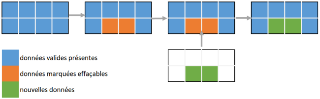 Vue simplifiée de l'impact du TRIM sur le fonctionnement du SSD. Plutôt que d’inscrire dans de nouveaux blocs, le contrôleur va écrire les nouvelles données là ou d'autres sont à effacer physiquement.