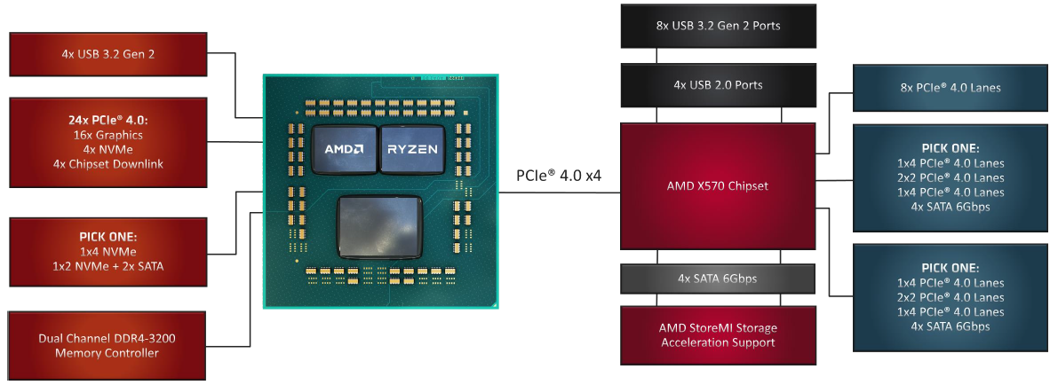 Ce dernier propose 4 ports USB 2.0, 8 USB 3.2 Gen 2., ainsi que 4 SATA 6 Gbps et 8 lignes PCIe 4.0. À cela s'ajoute jusqu'à 8 lignes PCIe supplémentaires scindées en 2 blocs (Pick One dans le schéma ci-dessus) de 4 : les fabricants de cartes mères pouvant les affecter comme bon leur semble (4 SATA 6 Gbps ou 1 port PCIe 4X (4.0) ou 4 ports PCIe 1X (4.0)). Selon la configuration retenue, le chipset gravé en 12 nm, peut consommer entre 11 et 16 W, nécessitant en conséquence un refroidissement la plupart du temps actif durant sollicitation.
