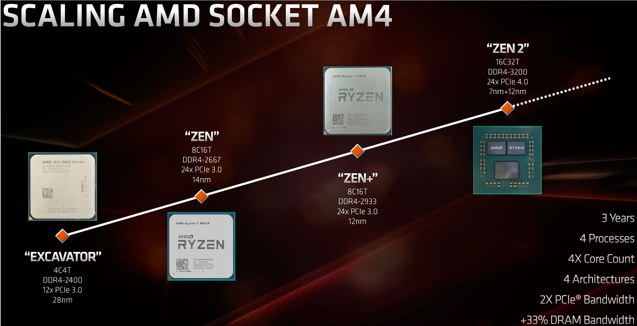 Pour accompagner ces nouveaux CPU, AMD réutilise son socket AM4, avec certaines limitations que nous allons découvrir un peu plus bas. Les rouges insistent sur la difficulté de maintenir un socket identique pour des CPU qui évoluent, tant au niveau du nombre de cœurs maximum, du procédé de fabrication ou de la fréquence mémoire.