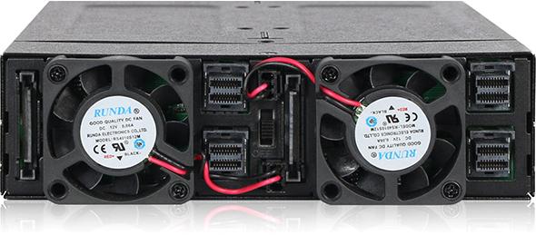 Le principe de base reste ainsi exactement le même avec un boitier solide 5,25" essentiellement fait d'acier et d'ABS disposant de 4 baies en façade et de 2 ventilateurs 40 mm sommairement ajustables (Off/ Low/ High) collés sur son derrière (attention, il parait qu'ils sont assez sonores, ce dont on n’en doute pas vu la taille). En tout cas, c'est une ventilation qui ne sera certainement pas de trop, puisque la raison d'être du MB720M2K-B reste l'accueil d'un maximum de 4 SSD PCIe x4 NVMe, sauf que ceux-ci devront cette fois-ci être au format M.2 (au lieu de U2 avec le MB699VP-B), peu importe le standard de 30 à 110 mm avec une installation sans-outil et un système de verrouillage facilement ajustable !