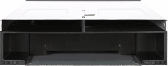 Plus précisément, vous pourrez y fourrer simultanément un disque dur 3,5" et deux disques/SSD 2,5" en SATA 6 Gb/s (épaisseur 9,5 mm max.), comme ça, simplement sans outil ni plateau, y'a qu'à insérer dans la fente correspondante avec douceur et finesse, et le p'tit indicateur d'activité bleu vous permettra de savoir si vous avez bien touché le fond pour chaque disque.