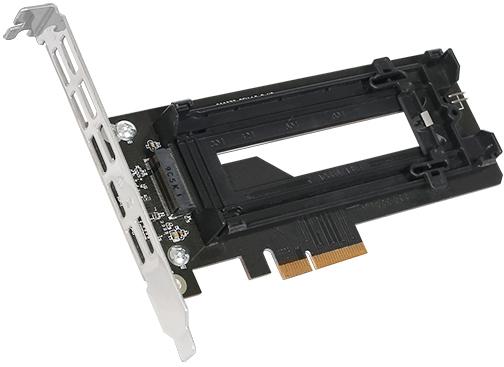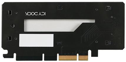 Comme c'est souvent le cas chez Icy Dock, l'installation du SSD sera fera sans outil et sans vis, grâce à l'adaptateur réglable, par ailleurs compatible avec toutes les tailles communément disponibles sur le marché grand public, c'est-à-dire de 2230 (30 mm) à 22110 (110 mm). La solution existera en 3 variantes, celle de base avec équerre PCI et sans radiateur est la MB987M2P-B ; le modèle se terminant par 1B sera équipé d'un grand dissipateur en aluminium avec coussin thermique ; la variante 2B profite aussi du radiateur, mais ne possédera pas d'équerre PCI, qui peut ne pas être nécessaire dans certaines configurations. Vous remarquerez aussi que la découpe au centre du PCB de la carte, laissant le dos du SSD à l'air libre, ce qui ne fera certainement pas de mal.