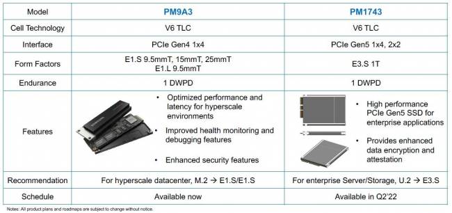 Justement, Samsung vient d'annoncer qu'il sera l'un des premiers à proposer un SSD PCIe 5.0 pour les serveurs des entreprises, le PM1743 ! Après une phase d'échantillonnage limitée début 2022, le constructeur planifie le démarrage de la production en volume pour le second trimestre de 2022, une période qui coïnciderait parfaitement avec celle du lancement de Sapphire Rapids chez Intel, ce qui ne sera évidemment pas un hasard. Après tout, ce sera la première plateforme pro du fondeur à supporter le PCIe 5.0 (et la DDR5) et celle d'AMD — avec les EPYC Genoa — est a priori attendue plus tard.