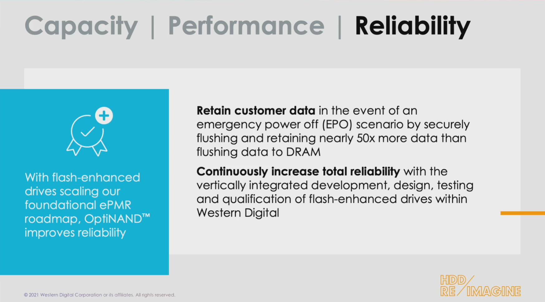 Dans le cas d'OptiNAND, en temps normal, toutes les données seront toujours lues depuis et écrites uniquement sur les plateaux, la mémoire flash ne stockera aucun fichier de l'utilisateur, mais uniquement les métadonnées d'usines et autogénérées par le disque dur pour son fonctionnement, et qui sont habituellement conservées sur les plateaux. Celles-ci peuvent facilement atteindre plusieurs Go. Par conséquent, ce déchargement permettra tout d'abord d'augmenter l'espace disque utilisable et par extension la densité du disque, mais aussi d'améliorer les performances, puisque le disque dur passera bien moins de temps à la recherche de ces informations et le fera aussi de manière bien plus efficace qu'avec de la DRAM. Enfin, WD vante aussi une amélioration de la fiabilité, notamment dans le cas d'une coupure de courant, le seul cas de figure où les données de l'utilisateur seront alors transférées vers l'iNAND, et le disque dur OptiNAND serait capable d'en capter bien plus (100 Mo contre 2 Mo, selon WD) et plus rapidement qu'un disque dur normal avec un cache DRAM. Un début de réponse de WD à Mach.2 de Seagate, mais sans la partie mécanique supplémentaire ?