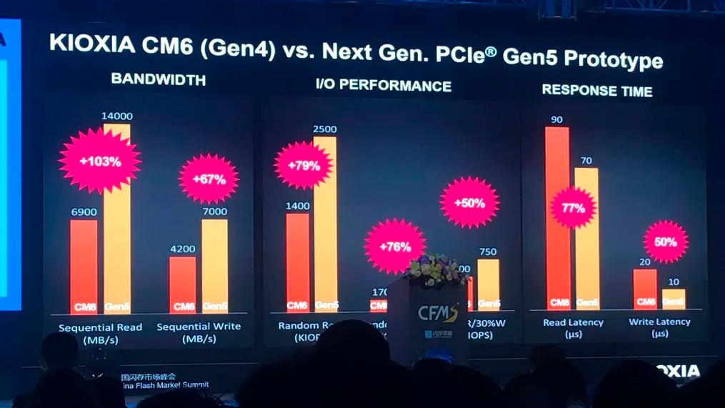Lors d'une présentation au China Flash Market Summit (ou CFMS pour faire simple), le constructeur japonais a teasé les performances de son prototype de SSD PCIe 5.0 avec quelques gros chiffres à l'appui ! Rappelons tout d'abord que le PCIe 5.0 offrira deux fois plus de débit que l'interface PCIe 4.0, avec 32 Gb/s par liaison contre 16 Gb/s, de quoi permettre une nouvelle génération de SSD qui laissera dans le vent toute la précédente sans sourciller ! Ainsi, assez à l'image de ce qu'avait montré Marvell pour ses premiers contrôleurs PCIe 5.0, le futur SSD PCIe 5.0 de Kioxia atteindrait 14 000 Mo/s en lecture séquentielle et 7000 Mo/s en écriture séquentielle — respectivement un gain de 103 % et 67 % par rapport aux SSD PCIe 4.0 actuels du constructeur, dont le meilleur du lot (le SSD CM6 lancé en février 2020) plafonne à 6900 Mo/s et 4200 Mo/s. Côté aléatoire, le PCIe 5.0 permettrait de gagner 79 % en lecture et 76 % en écriture (en partant de 170 000 IOPS). Les latences de lecture et d'écriture également seraient à la baisse, respectivement avec des réductions de 22 % et 50 %.