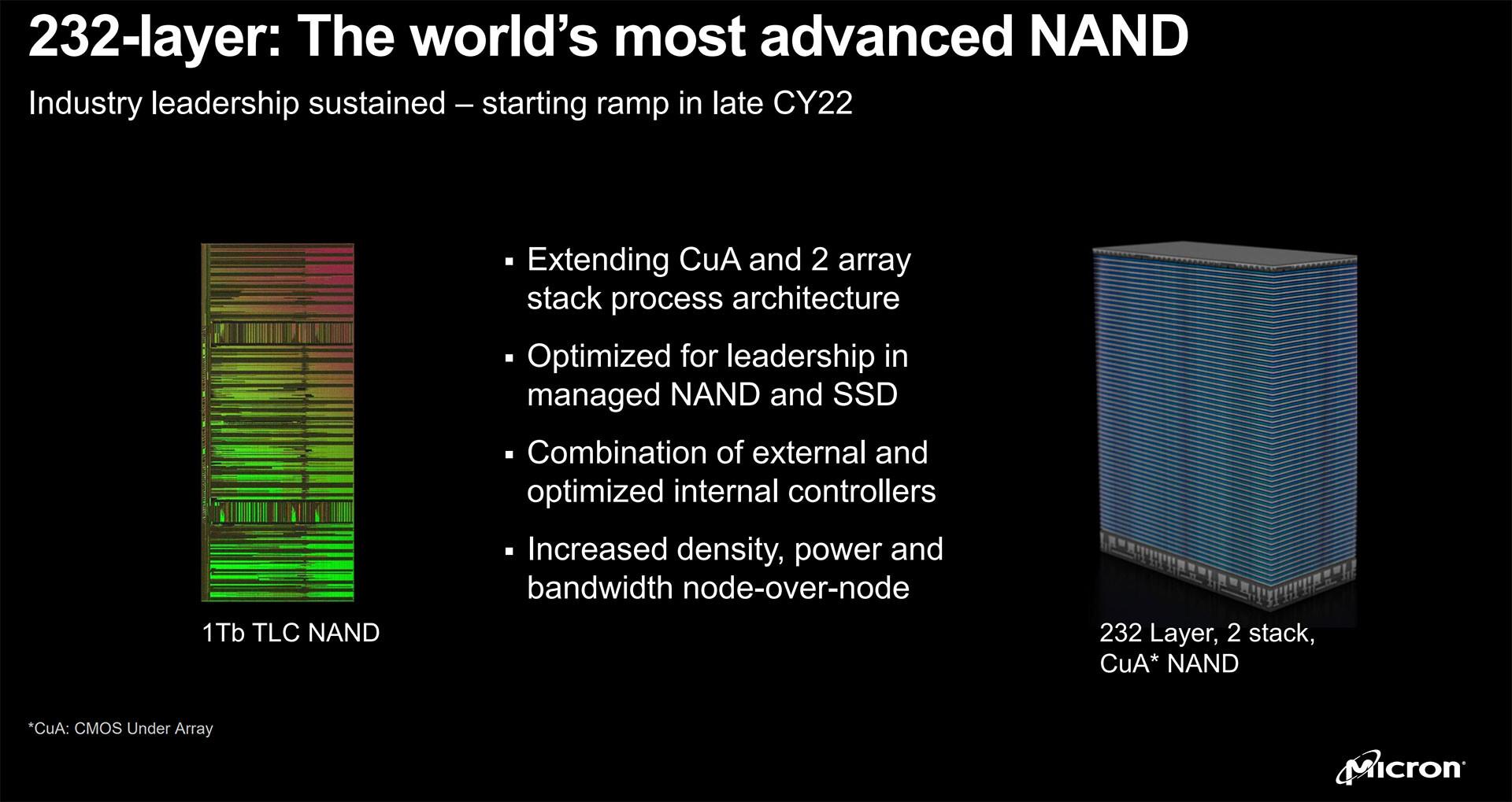 L'objectif de Micron est de commencer la production (en volume, sans doute) de sa nouvelle NAND encore plus tard dans l'année, ce qui veut dire qu'on devrait logiquement voir arriver les premiers SSD l'exploitant en 2023 - année qui sera d'aillleurs fort certainement celle du SSD PCIe 5.0, étant donné que la norme se sera démocratisée chez AMD et chez Intel. Il y a aussi fort à parier qu'une déclinaison QLC de cette NAND 3D 232L arrivera tôt ou tard par la suite pour des SSD de plus grande capacité et plus abordables. Enfin, Micron a brièvement abordé son avenir et dévoilé l'aperçu du chemin que l'entreprise s'est tracé pour son voyage de la NAND 232 couches d'aujourd'hui vers celle de plus de 400 couches d'après-demain !