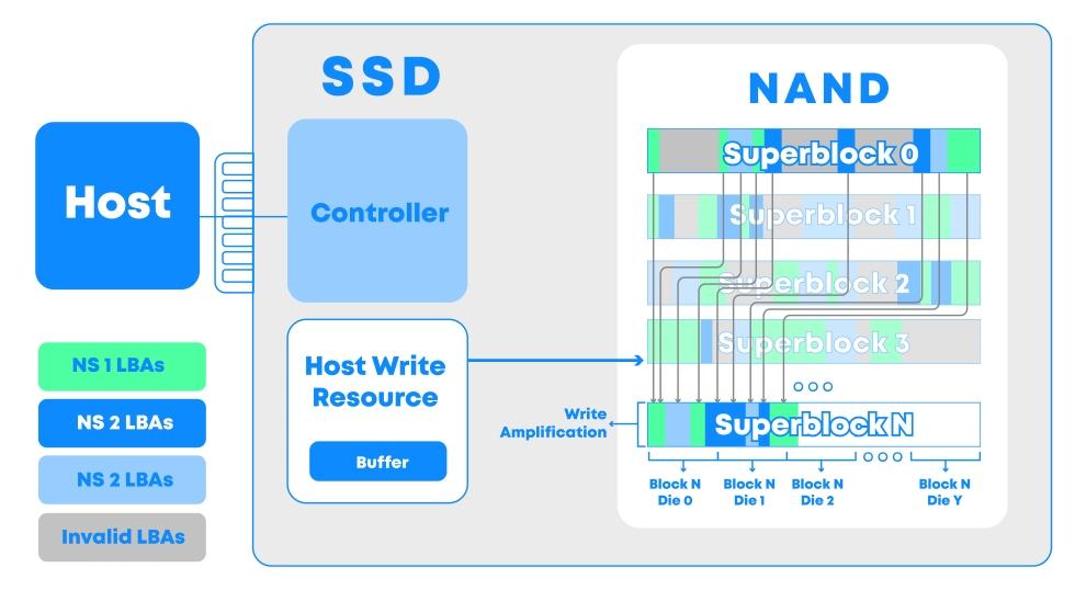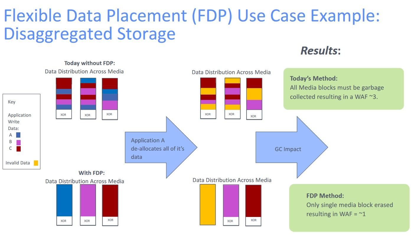 Tous ces mécanismes contribuent à « des vitesses d'écriture plus élevées, une latence plus faible et une durée de vie plus longue ». La société ajoute que des tests internes des algorithmes FDP intégrés au contrôleur SSD Bravera SC5 de Marvell et au micrologiciel DapuStor aboutissent à une amplification d'écriture (WAF, write amplification factor) proche de 1,0 (une WAF de 1,0 indique que le SSD utilise la NAND flash à son plein potentiel d'endurance sans gaspillage).