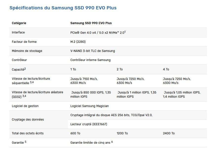 | 990 EVO PLUS | PCIe 5.0 x 2 et PCIe 4.0 x4 | 7250 Mo/s | 6300 Mo/s | 1050K IOPS | 1400K IOPS |