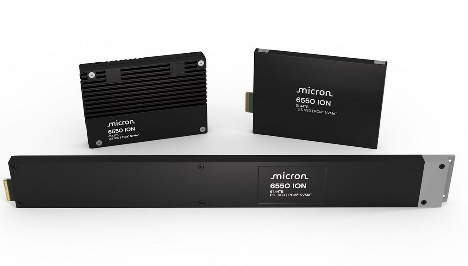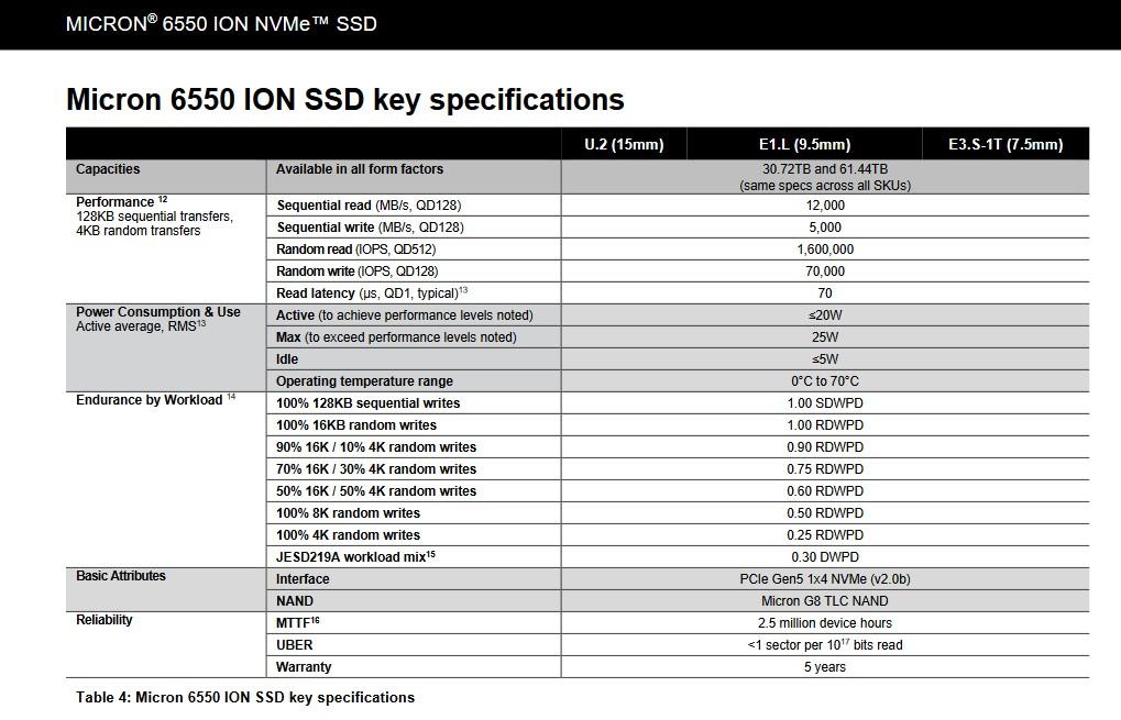 Commençons d’ailleurs par ce dernier, qualifié de 6550 ION. C’est un SSD de 61,44 To proposé dans des formats E3.S, U.2, E1. Il exploite de la mémoire NAND G8 TLC via une interface PCIe 5.0. Le disque peut être entièrement écrit en 3,4 heures.