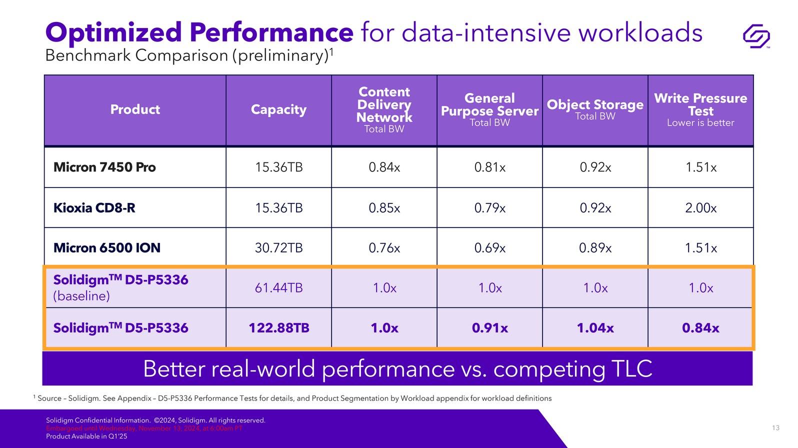 En ce qui concerne l'endurance, Solidigm évalue le disque à 0,6 écriture par jour (DWPD) sur cinq ans, soit 134,3 Po. Pour la capacité, la société affirme que son nouveau disque permet de stocker jusqu'à 4 Po de données par unité de rack.