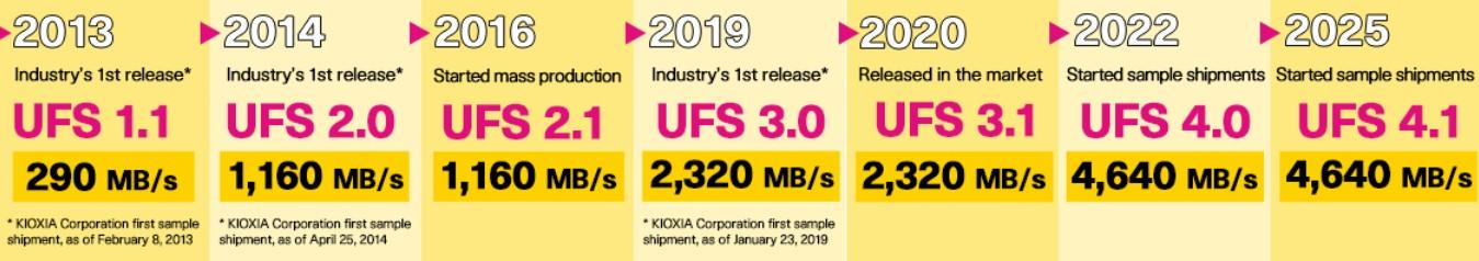 Kioxia a lancé l’échantillonnage de ses nouvelles mémoires UFS 4.1 embarquées. Le JEDEC a officialisé cette norme en janvier dernier (le 8 pour être précis), soit un peu plus de deux ans après la version 4.0 (août 2022). Déclinés en 256 Go, 512 Go et 1 To dans un format BGA standard, ces modules misent avant tout sur des optimisations architecturales plutôt que sur une montée en débits bruts — les spécifications théoriques de l’UFS 4.1 restant alignées sur celles de l’UFS 4.0 (comme la 3.1 par rapport à la 3.0 pour rester sur la précédente génération).