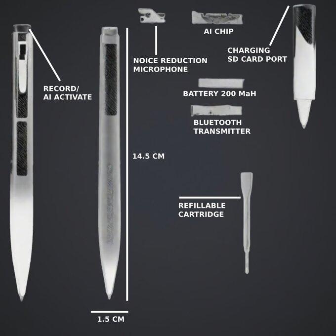 À première vue, l’engin ressemble à un stylo à bille on ne peut plus traditionnel. C’en est un, mais affublé d’une batterie (200 mAh), d’un modem Bluetooth (5.2), d’un microphone et d’une puce IA (la fameuse) ; éventuellement d’une carte microSD (pour l’enregistrement en mode hors ligne).