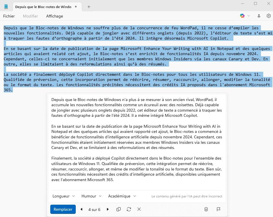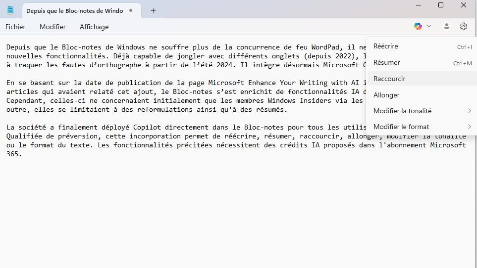 Finalement, la société a décidé de déployer Copilot directement dans le Bloc-notes pour tous les utilisateurs de Windows 11. Bien que qualifiée de préversion, cette intégration permet de réécrire, résumer, raccourcir, allonger, et même de modifier la tonalité ou le format du texte. Bien sûr, ces fonctionnalités nécessitent des crédits IA disponibles dans l'abonnement Microsoft 365, parce que même les assistants numériques ont besoin d'être payés !