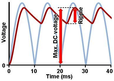 Démonstration du lissage : en gris, la tension sans condensateur, en rouge la tension "lissée"