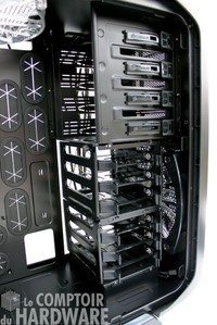 Autre point étonnant : l'énorme ouverture permettant de fixer la backplate d'un ventirad sans avoir à démonter la carte mère, certainement démesurée, mais qui s'en plaindra ? En effet, nous avons déjà vu des espaces insuffisants, car chaque carte mère n'a pas le socket strictement au même endroit. L'emplacement de l'alimentation comporte un système réglable permettant de fixer toutes tailles de blocs conventionnels, des classiques aux plus longues, rappelons sur ce point l'existence d'une grille sous le boitier, filtrée, permettant le libre accès de l'air extérieur au bloc. Les compartiments des disques durs sont au nombre de deux pouvant chacun accueillir 3 disques en position "face à soi", connectiques vers le flanc gauche du boitier, ce qui a un double avantage : les câbles sont invisibles et ne gêneront pas la connexion à l'alimentation de la carte graphique.