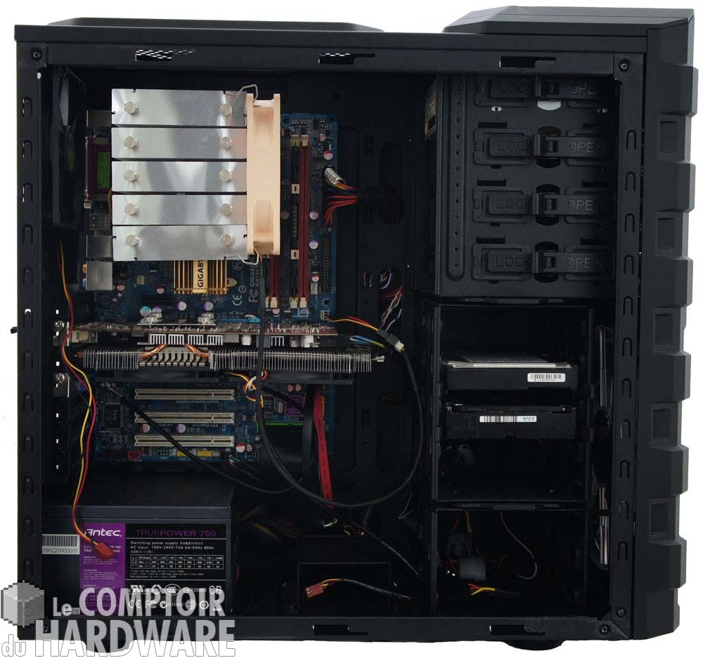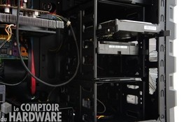 L'accès backplate est bien conçu et permet le montage une fois la carte mère fixée. Lorsque tous ces éléments sont en place, nous installons une HD 3870 X2 afin de vérifier si cette carte de 27cm passe sans problème, ce qui est le cas. Nous la remplaçons ensuite par la HD5770 de test, équipée du Scythe Musashi, puis nous nous attaquons aux lecteurs CD et disques durs. Avant d'installer le lecteur optique, nous devons enlever le cache-baie correspondant ; c'est simple, il suffit pour cela de le pousser depuis l'intérieur, nous remarquons alors qu'il est équipé d'une protection contre la poussière. On insère ensuite le lecteur optique depuis l'extérieur et l'on actionne le levier de fixation rapide correspondant pour verrouiller (de "Open" vers "Lock"), rien de plus simple.