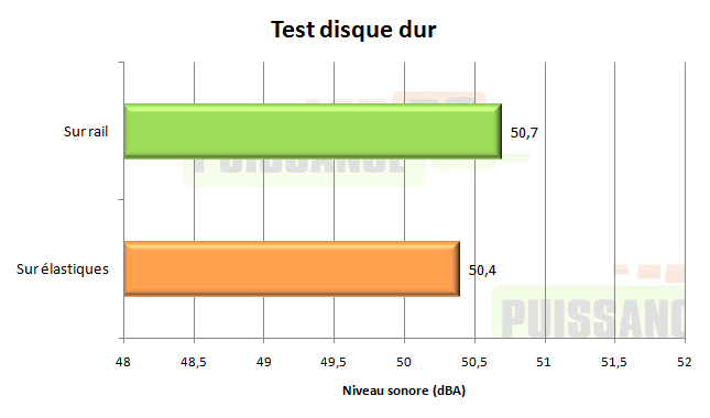 Une chose est sûre: à l'oreille il n'y a strictement aucune différence. Ce n'est en réalité pas le système à élastique qui est à l'origine de ces résultats proches, mais le système de rails. Si celui-ci avait été de mauvaise qualité comme dans beaucoup de boîtiers une différence aurait sans doute été perceptible entre les 2 types de fixations, mais le système de rails d'Antec est particulièrement bien conçu et les patins en silicone font des merveilles. Résultat il n'y a pas grand chose de plus à gagner à passer à des fixations élastiques.