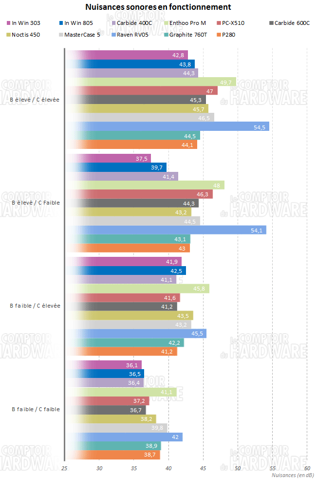 Un seul ventilateur livré, des ouvertures sans trop en abuser, il est logique que le In Win 303 se révèle être un boîtier plutôt peu bruyant. Lorsque tout le matos tourne à pleine vitesse, l'ensemble est audible, mais sans excès. En régulant la configuration, le bruit généré devient presque anecdotique et le 303 se fond dans l'ambiance sonore générale. Réguler le ventilateur n'a qu'un très léger impact sur les nuisances sonores dégagées. On gagne alors moins d'un décibel en gardant la configuration au maximum et -1.4 dB en régulant l'ensemble. Nous pouvons dire que le In Win 303 est un boîtier silencieux.