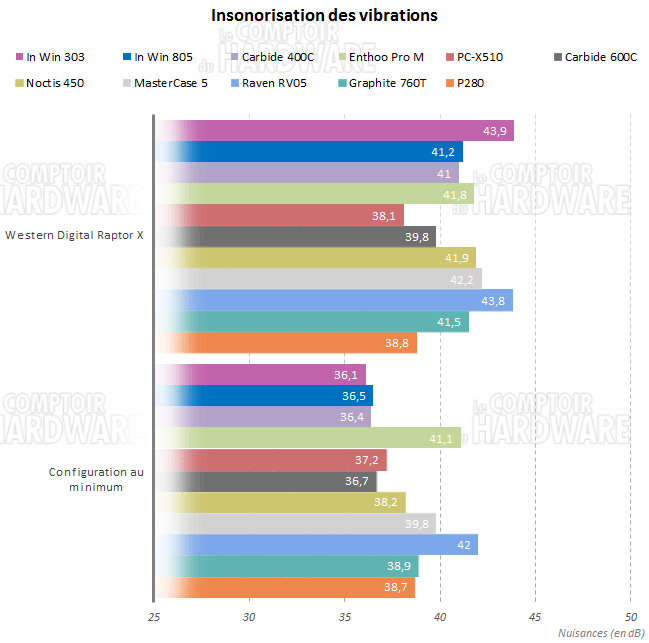 Le disque dur de test étant déjà largement audible ici, nous craignions le moment de tester le Raptor X. Le vieux disque dur vient à bout de ce boîtier qui ne parvient pas à réfréner ses ardeurs. Le niveau sonore augmente considérablement dès que le disque dur atteint sa vitesse de croisière. Il génère alors énormément de vibrations qui sont transmises dans tout le châssis. Lors des phases d'écritures, nous enregistrerons un pic à près de 44 dB. Oubliez ce type de matériel si le In Win 303 vous fait de l'oeil.