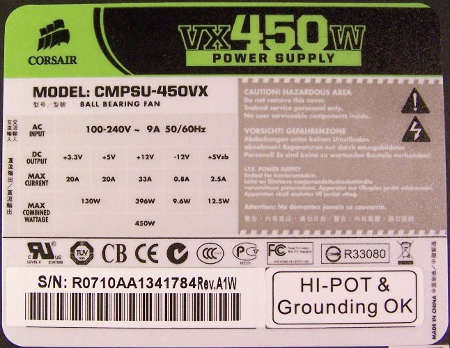 L'alimentation malgré le prix n'a pas subi les affres de la limitation des coûts, et c'est donc une belle robe noire que revêt la VX450W. Un autocollant vert reprend également le logo de la marque et la référence de l'alimentation, pour un résultat avec le ventilateur noir profond assez classieux. Cette alimentation ne dénotera donc pas dans une configuration travaillée esthétiquement et avec paroi en plexiglas.