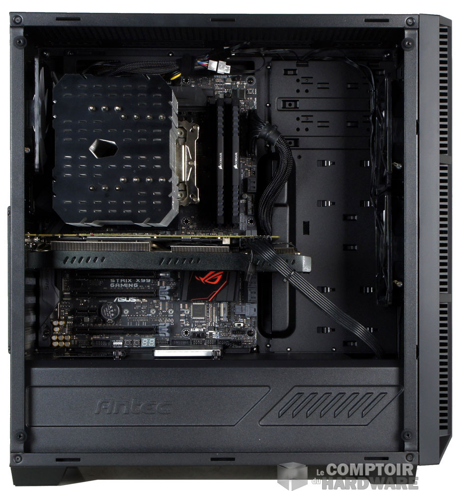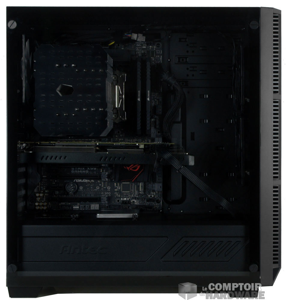 Voilà pour la description de ce modèle signé Antec. Le montage s'est fait sans trop d'effort, car il y a de la place. Les contraintes imposées sont de 165mm pour le ventirad, 390mm pour le ou les GPU et jusqu'à 240mm pour l'alimentation.