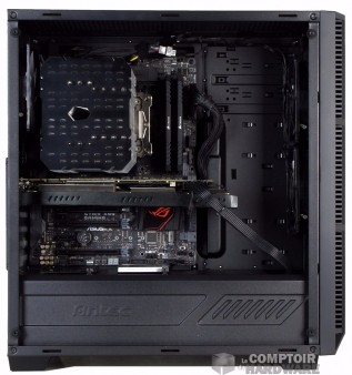 Les panneaux qui ferment le boîtier sont plus intéressants. Celui de droite (arrière de la carte mère) est en acier, solide et très sobre lui, tandis que le second, plus matez-mon-intérieur, est l'élégant panneau de verre dont nous parlons plus haut. La finition est de bonne qualité sur cet accès et son contour est relevé par un bandeau noir qui donne une bonne finition à l'ensemble une fois installé.