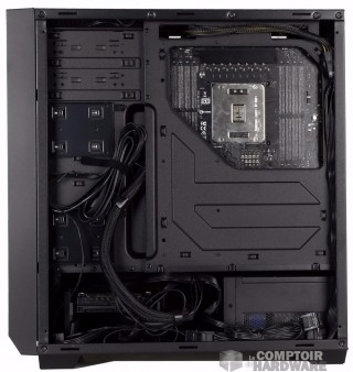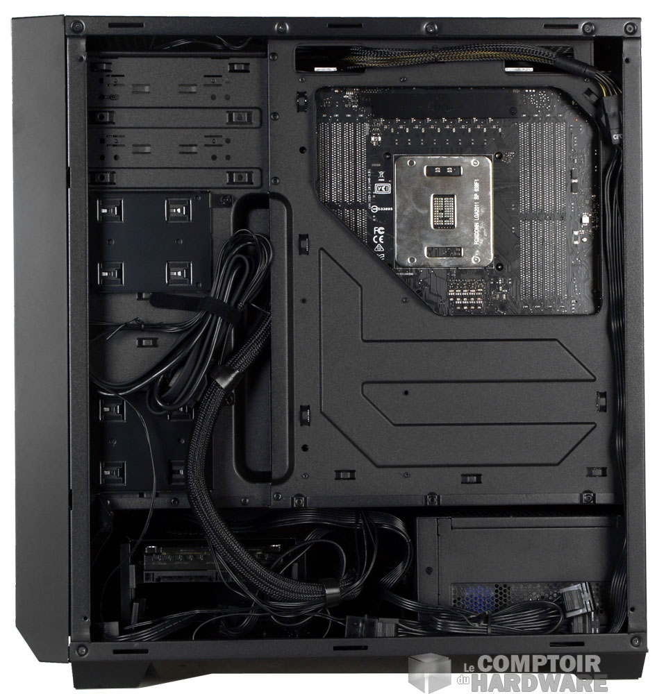 Le plateau de carte mère n'est pas constellé de passages de câbles comme nous le voyons souvent, seule une goulotte est présente sur la droite pour laisser passer le nécessaire (24 broches de la carte mère, SATA etc..). Vous pouvez installer dans votre P8 une carte mère ATX, mais aussi Micro ATX ou Mini ITX.