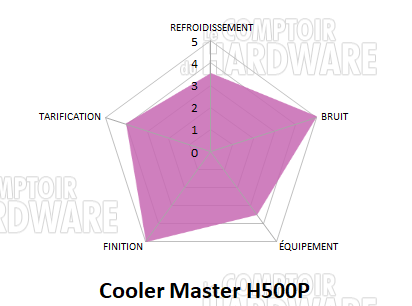 Nous en avons terminé avec ce boîtier tant attendu. S'il ne déçoit absolument pas côté design et qualité, nous restons sur notre faim niveau performances. Le boîtier se montre très agréable à l'usage du fait de l'emploi de ventilateurs peu véloces, mais la facture se paye sur les performances en refroidissement. Descendant de la série HAF, on s'attendait vraiment au blizzard. Les résultats restent bons comme vous l'avez vu, mais sont sacrifiés sur l'autel de la discrétion; ce qui reste une très bonne chose. L'équipement mériterait plus d'attention selon nous. Le seul filtre à poussière valable se situe sous le boîtier. Les aérations sont aussi protégées. L'efficacité du système utilisé n'est pas convaincante par contre. On regrette aussi l'absence de connectique plus récente sur le panneau avant (qui parle encore d'USB Type-C ?!) ou du support vertical à l'intérieur. Pour le reste, on le laisse à l'appréciation de chacun puisqu'un nombre incalculable de baies 3.5" et de quoi installer des lecteurs optiques n'est plus vraiment nécessaire de nos jours. Quant au prix de vente, il se situe dans une fourchette délicate pour le MasterCase H500P. Il s'agit clairement d'un modèle coup de coeur avec lequel il faut faire certaines concessions ou investir pour qu'il en jette encore plus. Nous avons apprécié cette entrevue avec ce HAF sauce 2017 qui n'est clairement pas exempt de défaut(s). Nous quittons le Cooler Master MasterCase H500P en lui attribuant tout de même 4 étoiles qu'il mérite, la cinquième tombant à cause du mauvais ratio prix/équipement !