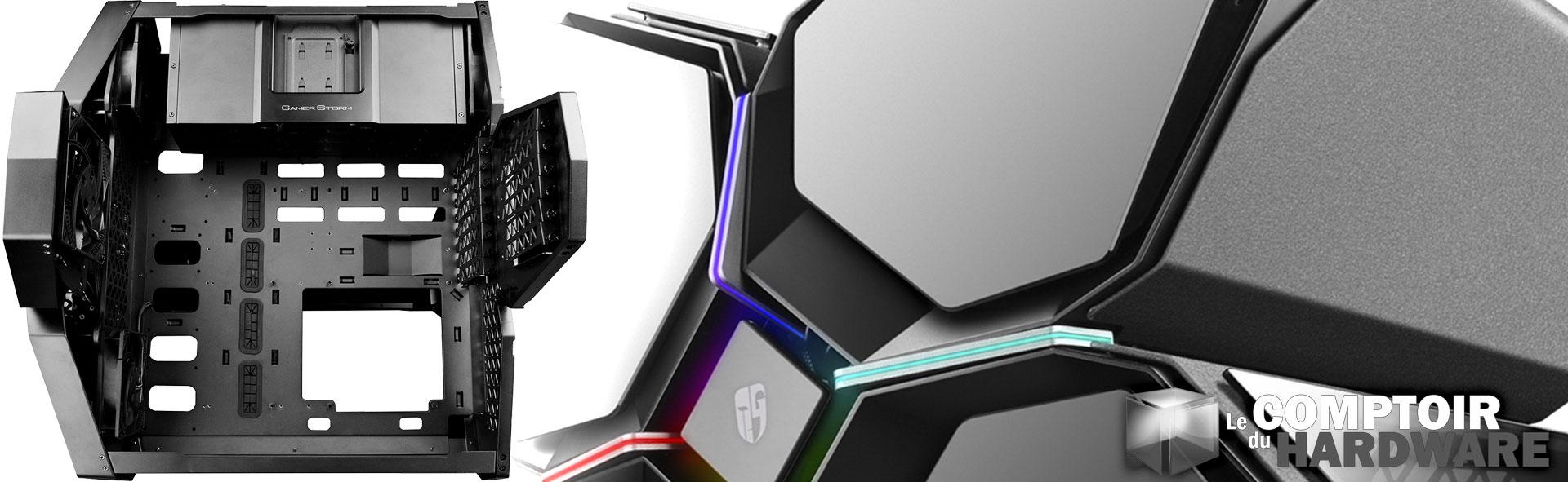 La marque DeepCool, par l'intermédiaire de sa branche Gaming Gamer Storm, continue de développer son armada de boîtiers de l'espace. Nous vous présentions en 2015 le Tristellar, modèle assez marginal, dédié uniquement aux cartes-mères de petit gabarit. DeepCool l'a vite compris, il fallait quelque chose de plus gros pour toucher plus de monde. Que faire ? Ajouter un quatrième compartiment au Tristellar pour gagner en volume ? Pourquoi pas. Et on appellerait ça comment ? Quadricolor, comme les quatre couleurs primaires ? (Bruno Vandelli, 2001. Et le lien si vous n'avez pas la ref !). Non, bougre d'âne ! Quadstellar ! Logiquement, 2018 oblige, l'ovni en provenance de chez Gamer Strom est lumineux et vitré. Par contre, il débarque avec quelques innovations gadgets, mais bien sympathiques. Faisons ensemble le tour de ce boîtier hors-norme.
