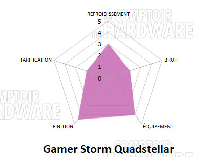 Nous en avons terminé avec ce modèle et notre conclusion ressemble plutôt à des reproches. Oui, le Quadstellar ne manque pas de défauts, mais il n'en est pas moins attachant. Il joue de son charme pour nous séduire et de sa technologie pour nous convaincre qu'il est l'Unique. Les nuisances sonores qui l'accompagnent sont vraiment horribles à pleine vitesse, difficilement supportables, mais tant pis, on s'y fera ! Les températures dépendront de vos choix alors débrouillez-vous ! Nous ne saurions trop vous conseiller le watercooling pour ce modèle, tant qu'à faire dans la démesure, autant y aller jusqu'au bout. Il faudra également réfléchir à l'aération du boîtier. Les TF120 livrés sont un calvaire, ça vous le savez puisque nous le répètons depuis le début des tests. Trouver l'équilibre n'est pas aisé dans cet espace plutôt conséquent, alors pourquoi ne pas opter pour un lot de Noctua ? Mis à part la pauvreté du front panel, l'équipement reste assez cohérent pour le niveau de standing du produit. Vous trouverez un contrôleur wifi, la gestion par application de la couleur ou des effets lumineux ou encore la présence de moteurs pour l'ouverture de la façade. Reste à pouvoir sortir les 500 balles demandées pour choper ce modèle. Il s'agit d'un boîtier haut de gamme et le prix s'en ressent. Pour finir, s'il fallait noter le Quadstellar selon notre barème habituel, il repartirait avec un gros 2 ou un petit 3. Mais nous n'allons pas le traiter comme les autres. Ce modèle hors norme nous convainc sans mal par son design. On aime les gadgets qu'il embarque, même s’il est certain que passé l'effet de surprise, on les abandonnera. Le prix est un frein certain et l'investissement supplémentaire ainsi que le bricolage qu'il demande pour être vraiment parfait décourageant. Mais, à l'issue de ce dossier, nous offrirons tout de même notre coup de coeur au Quadstellar de Gamer Storm, pour son audace et son look !Nous remercions naturellement nos partenaires pour la mise à disposition du matériel de test.