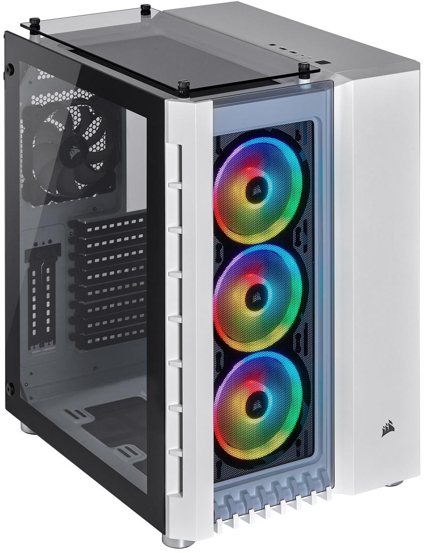 Le lien de parenté avec le Crystal 280X est fort évident du fait d'un design commun, plutôt sympathique. Nous avons pu constater que le châssis provenait également d'un modèle existant au catalogue. Certes il est modifié pour l'occasion, mais ce n'est pas franchement du neuf. En ce qui concerne le look, il est travaillé, moderne et sait rester passe partout. La pointe de lumière trahira votre côté geek. On ne trouve rien à redire sur la finition du modèle, encore une fois c'est du bon travail. Concernant le châssis, nous avions vu le même sur le Carbide Air 740. Ici, Corsair ajoute deux slots PCIe verticaux à l'arrière et retire les supports HDD du fond pour y installer un emplacement de ventilation.