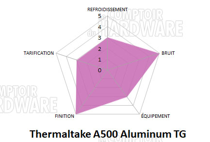 Ce A500 Aluminum TG c'est un peu les montagnes russes. On est hyper emballé par son design élégant, ses matériaux nobles et la discrétion dont il fait preuve malgré son gabarit. Le boîtier est beau et il est aussi pratique à utiliser. L'ouverture des panneaux est facile et rapide, l'intérieur est vaste et l'installation se fait aisément. Il faudra par contre user du tournevis, les fixations sans outil ne concernent que les racks 3.5". Pour couronner le tout, à l'allumage, le modèle se montre assez discret ! Jusque là on est hypé. Arrive maintenant le contrôle plus en détail. On trouve un front panel plutôt bien équipé : deux ports USB 2.0, deux ports USB 3.0, un port USB Type-C et les E/S audio. Jusque là, c'est pas mal. L'intérieur est bien fourni en supports de stockages, ventilateurs et filtres, mais c'est tout. Oui, ce boîtier haut de gamme ne proposera rien de plus, ce qui est assez décevant quand on en connait le prix. Au niveau des performances, la discrétion est son point fort comme nous l'avons déjà souligné. Le flux d'air généré est tout aussi modéré, ce qui se ressent sur les températures. Nos relevés montrent que le GPU sera mis à rude épreuve pendant l'effort. Il faudra modifier l'agencement côté plateau pour gagner quelques degrés. Le tarif demandé nous apparait bien élevé au vu des éléments que nous avons relevés. Le modèle est bien fait certes, avec ses matériaux prémiums, mais il manque d'équipement à nos yeux. Son prix de lancement était de 269 €, on trouve dorénavant la bête à 220 €, ce qui reste un poil chérot. On reste un peu sur notre faim avec ce modèle, c'est pourquoi nous n'attribuons que 4 étoiles au A500 Aluminum TG de Thermaltake, qui manque de prestations pour le prix demandé.