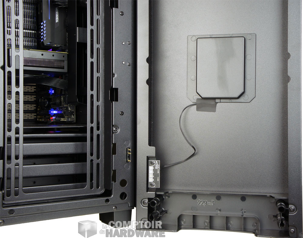 Les deux panneaux latéraux plein format sont en verre trempé, fortement teinté. Afin de pousser l'épurage à fond, aucune vis ni même de système d'ouverture n'est apparent. Alors, comment faire ? On voit ça juste en dessous du récap des dimensions.