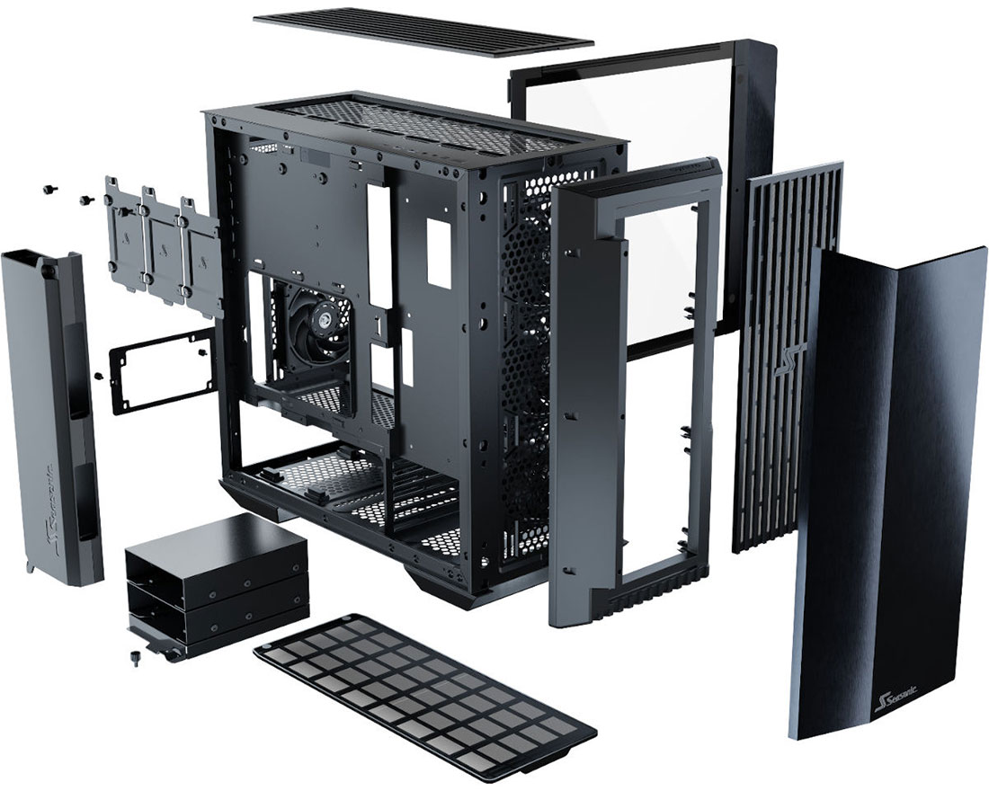 Mais parlons d'abord de l'équipement, puisque ce premier modèle signé Seasonic est relativement bien équipé. Pour parler du boîtier en lui même, il arrive d'emblée avec quatre ventilateurs de type industriel, il offre beaucoup d'espace pour la ventilation, avec quatre emplacements vacants, et des supports compatibles 120/140 mm. Le châssis est entièrement filtré On trouvera un large filtre en nylon sur l'avant, le même sur le dessus et un troisième sur le fond; le tout aimanté et extractible. Le stockage est confié à une baie 3.5" pour deux disques durs et trois supports 2.5". La connectique dont dispose le modèle se compose de deux ports USB 3.0, un port USB Type-C et les traditionnelles E/S Audio.
