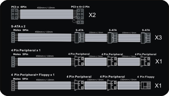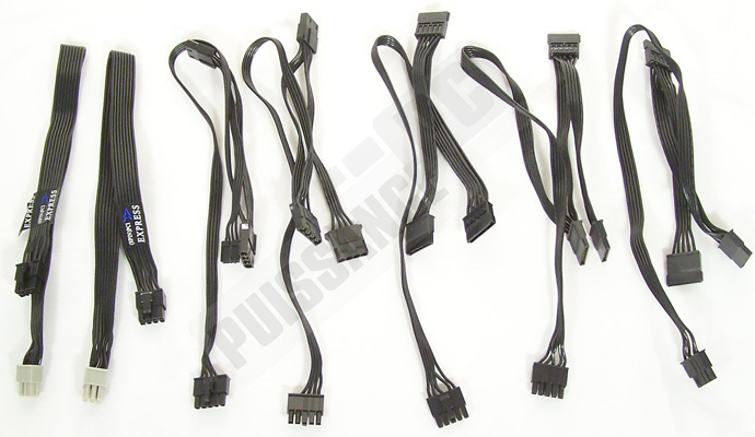 7 câbles modulaires "plats" sont fournis avec la Silent Pro M 700W. De gauche à droite nous retrouvons ainsi les 2 PCIe 8 pins, un 2 molex + floppy, un 3 molex, et 3 câbles de 3 SATA chacun. Des prises SATA à profusion donc, 9 en tout, avec par contre peu de molex et seulement 2 PCIe ce qui est dommage car à l'heure actuelle les cartes graphiques sont de plus en plus gourmandes et une alimentation 700W devrait à notre avis proposer 4 prises PCIe afin de pouvoir envisager un Crossfire ou SLI de cartes graphiques ultra puissantes...