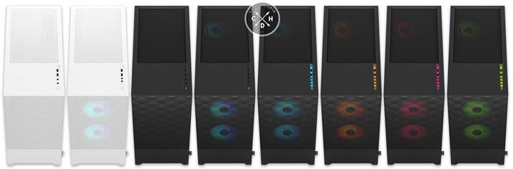 Les boîtiers embarquent trois ventilateurs de 120 mm, des emplacements de stockage en nombre suffisant, de quoi installer de la ventilation supplémentaire si besoin, des filtres et surtout un support 5,25" externe ! Si ce format ne vous est pas utile, qu'à cela ne tienne, un vide-poche accessible depuis l'extérieur comblera l'espace. Notez également la présence d'un hub de gestion de l'éclairage pour les versions RGB.