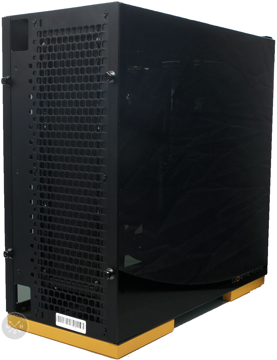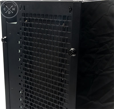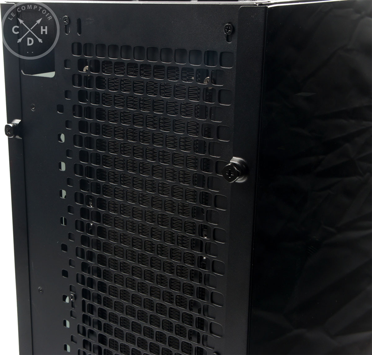 Sur l'arrière... rien ! pas d'espace pour l'alimentation, pas d'I/O Shield, pas de slot d'extension ! Nous ne trouvons qu'une large grille d'aération et deux ouvertures en haut et en bas. Sous le boîtier c'est pareil, l'espace est occupé par une grille de ventilation et deux pieds.