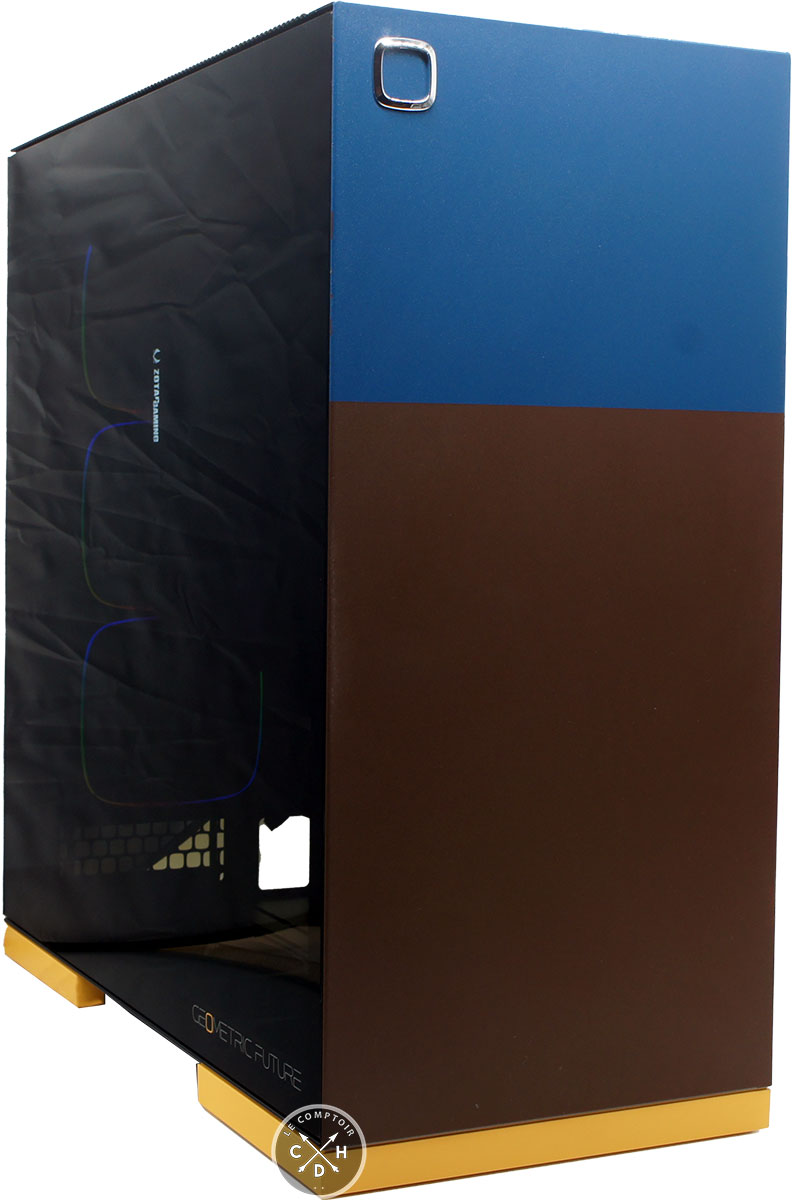 On ne verra rien dépasser de ce boîtier, mis à part de la matière. La face avant est recouverte de celluloïd coloré, marron et bleu. Le logo de Geometric Future est apposé sur le haut.