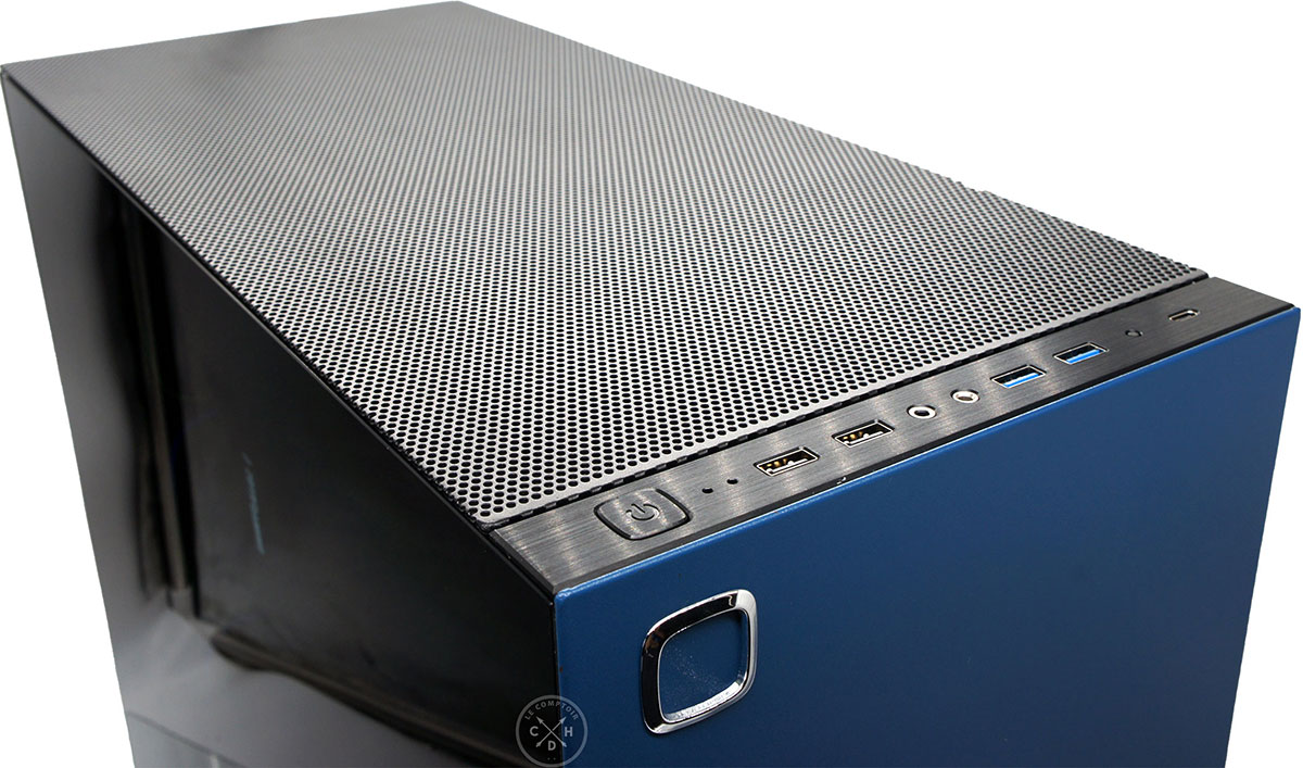 Au-dessus du boîtier nous trouvons la connectique externe. Elle est composée de deux ports USB 2.0, deux ports USB 3.0 d'un port USB Type -C et des E/S Audio. Le reste de l'espace est recouvert d'une grille alvéolée
