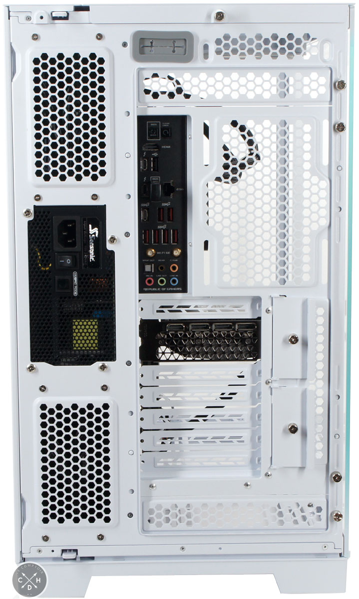 De l'autre côté, nous voyons le potentiel d'intégration : huit slots d'extension avec fixation sans outils, un ventilateur de 120 et quelques vis à main qui ne servent pas à maintenir le panneau vitré. On verra cela plus loin.