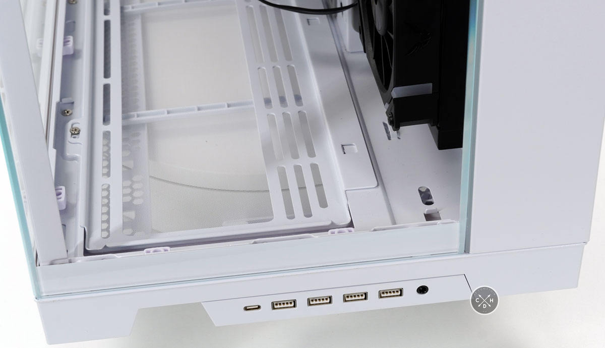 On fait un rapide tour du propriétaire, puisqu'il reprend l'aspect général des autres modèles de la série. On voit un panneau vitré encore plus large que les autres, la plaque latérale qui supporte les boutons de mise en marche et la gestion de l'éclairage, et la connectique externe toujours installée sur un support mobile qui propose ici quatre ports USB 3.0, un port USB Type-C et l'audio sur un seul mini jack.