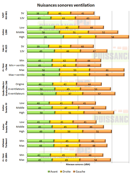 Le niveau sonore est ainsi tout simplement le plus bas atteint en 12V, et est inférieur malgré les 2 ventilateurs en 12V à celui par exemple du Sonata Plus avec son unique Antec Tricool réglé en "Mid".