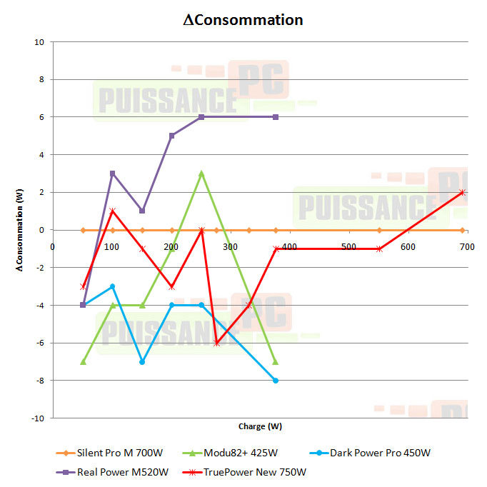 Pour comparer les consommations de nos alimentations testées nous avons choisi un modèle de référence, en l'occurrence la Silent Pro 700W de Cooler Master qui est pour le moment la seule à avoir passé toutes les mesures de notre protocole, et nous avons pour chaque charge placé nos autres alimentations en fonction du fait qu'elle consommait plus ou moins que la Silent Pro. Une courbe au-dessus de la ligne orange signifie donc que l'alimentation consomme plus que la Silent Pro 700W, une courbe en-dessous moins.