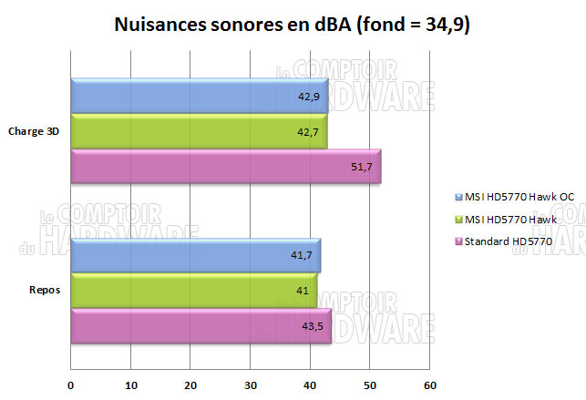 Première chose qui retient notre attention : quel que soit le cas, la V1 reste toujours plus bruyante que la Hawk. Second point intéressant : même en charge, la carte ne s'affole pas et reste dans des nuisances sonores tout à fait acceptables très proches de l'état de repos. Troisième et dernier point : même overclockée assez sérieusement, la carte ne modifie pas sa façon de gérer la ventilation, preuve que le Juniper chauffe peu, et preuve aussi que le radiateur dissipe très bien la chaleur sur toute sa surface, ne créant pas de pic de chaleur qui modifierait la vitesse de ventilation. Excellent performance du Twin Frozr II qui confirme le bien qui a été dit sur lui chez nos confrères.